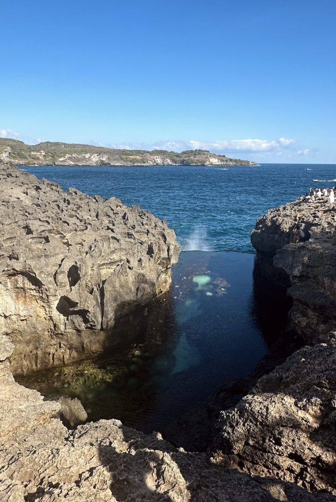 天神浴池的景色实在是太美了,让你随便一拍都是电影大片!紧挨着破碎沙滩的它,是一处被火山岩雕刻而成的天然 “无边泳池”。岩石上完全是天然形成的 “浴池”,海水从岩石缝隙里渗透进来,清澈得就像一块巨大的蓝宝石!碧绿清澈的池水在阳光下闪着光,与远处深邃的印度洋无缝连接,仿佛是**‘天使’的私人浴池**。