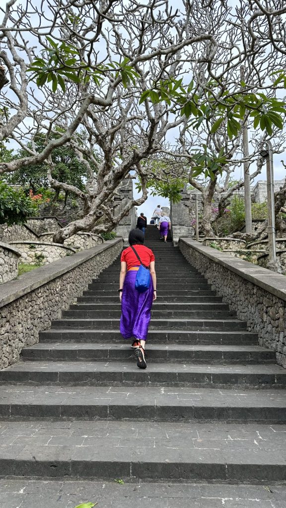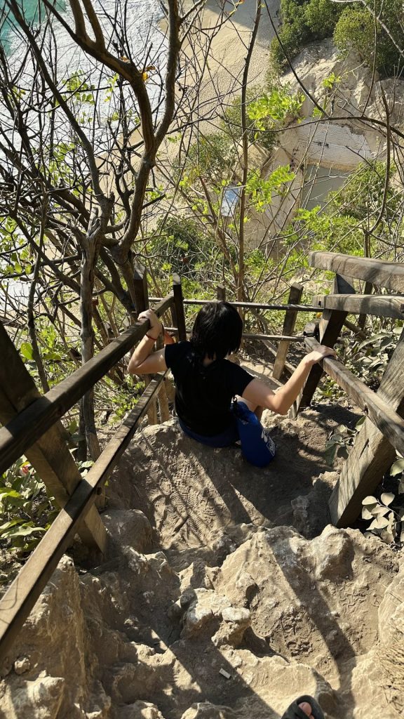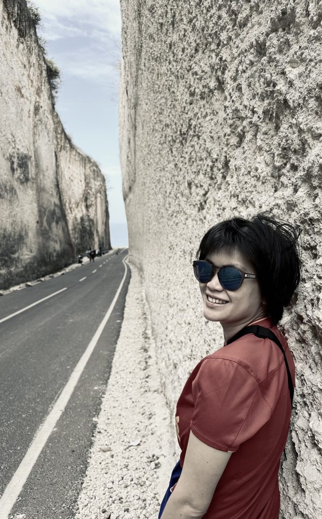 坐在这里,耳边是海浪有节奏地拍打岩石的声音,眼前是一望无际的壮阔海景。这一刻,仿佛整个世界都安静了下来,真的有种与世隔绝的宁静与美好。这简直是心灵放空的最佳时刻。我们这次的努沙佩尼达岛之行,目标不只是为了海滩美景,更是为了征服那条被众人视为极具挑战的 Kelingking Beach(精灵沙滩)下山路!当地人都说难?越难我们越想做! 也许就是这种 “越不容易得到,就越香” 的肤浅心理在作祟吧。对于我们这些久疏运动、体力欠佳的人来说,这无疑是一次巨大的挑战,真的是 “要了老娘的老命”!整个徒步过程中,我们完全是靠着仅有的意志力在顽强地活着。幸好,路上总能得到其他登山客的 assurance 和 encouragement,一句 “值得下去”,一句 “加油”,就足以让我们彻底拼了!是的,我们就是那么的肤浅,为了美景和征服欲,再难都得下!