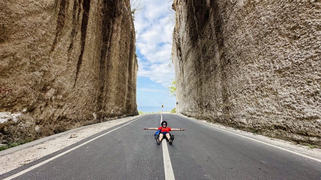 道路两侧高耸的石灰岩悬崖巍峨对峙,将这条路衬托得既渺小又震撼。这种独特的地理环境,提供了一个绝佳的天然拍照背景。无论你从哪个角度拍摄,这里都是一个不容错过的最佳摄影点